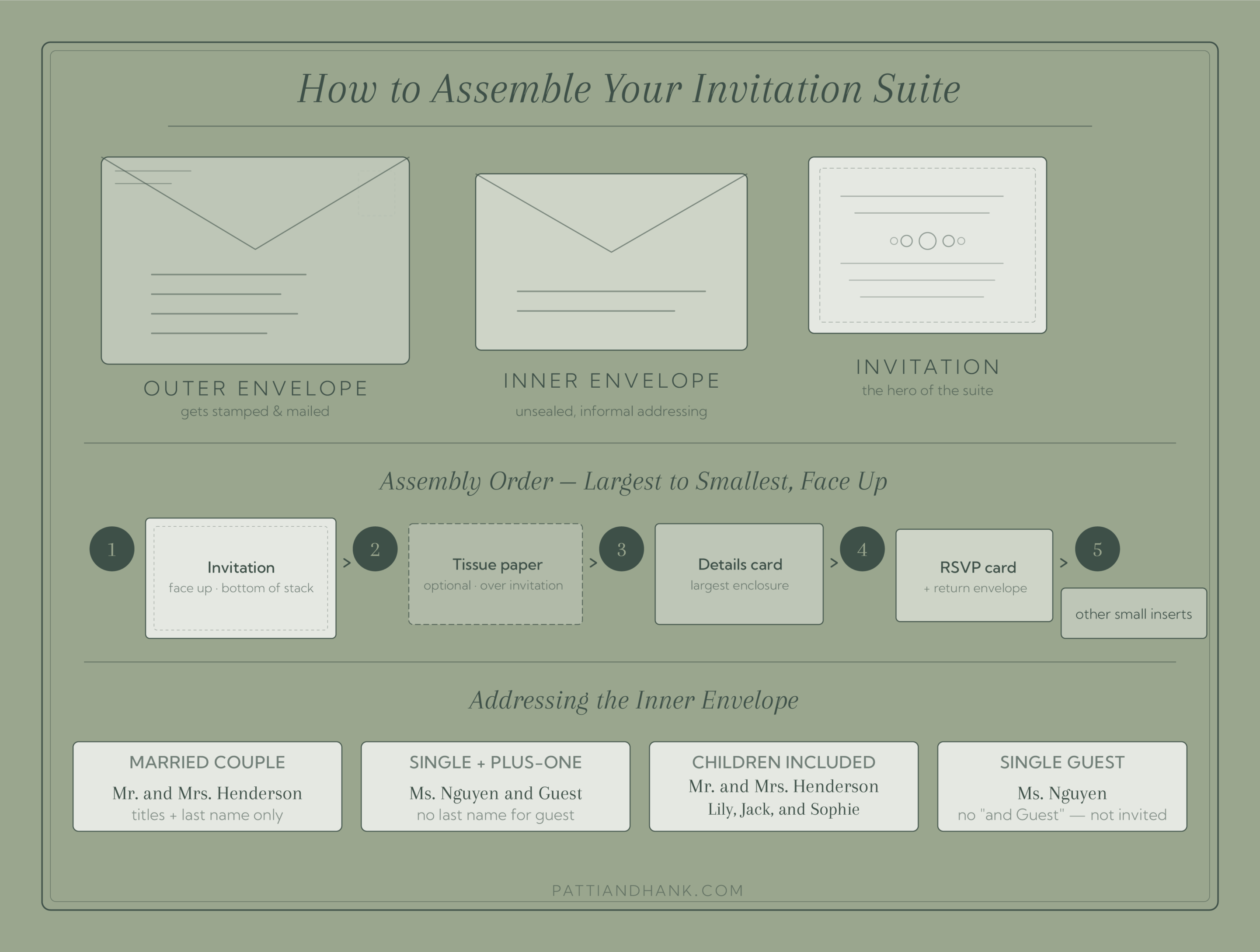If your outer envelope is addressed to "The Henderson Family," your inner envelope might read "Mr. and Mrs. Henderson," a polite but clear signal that the children aren't invited to the wedding itself.