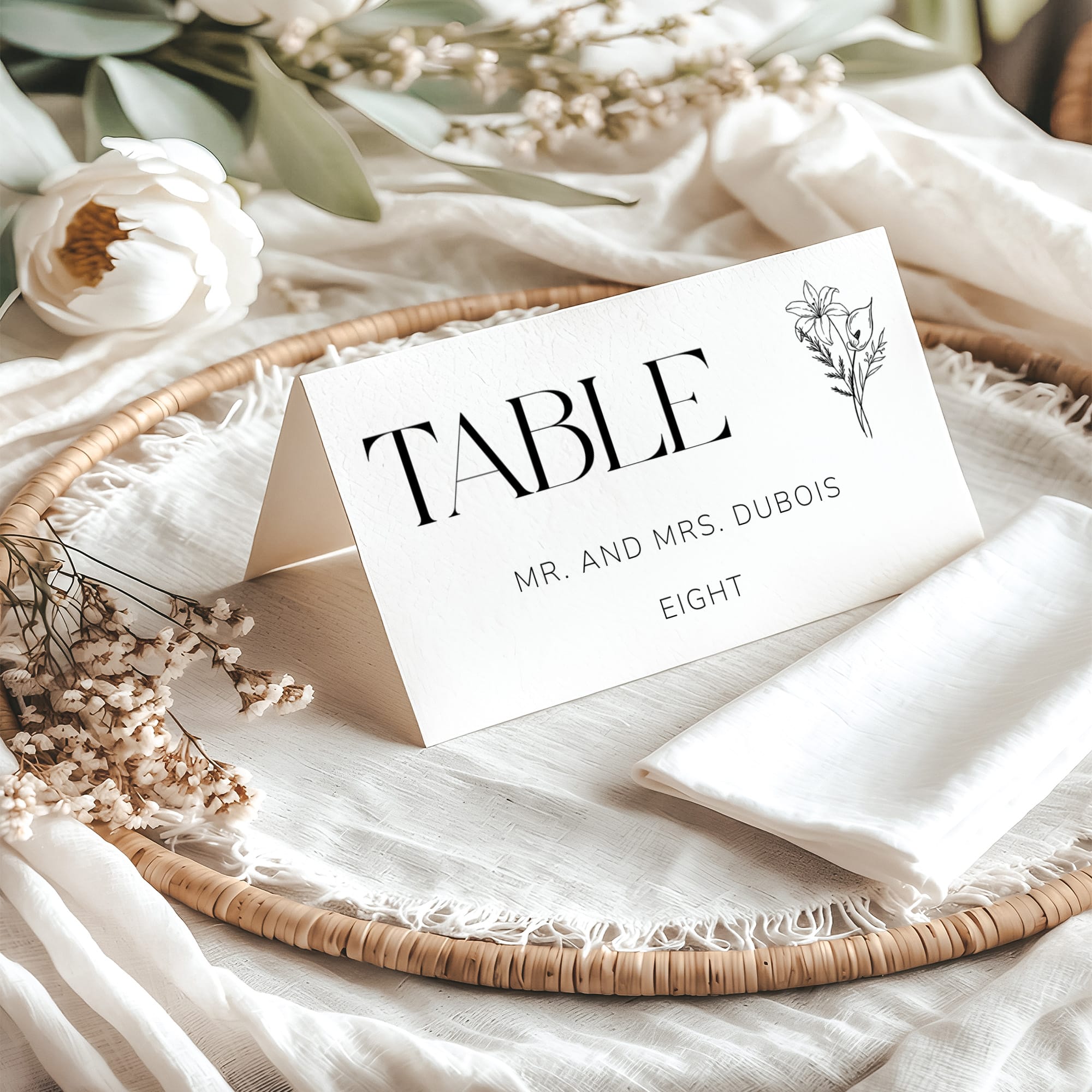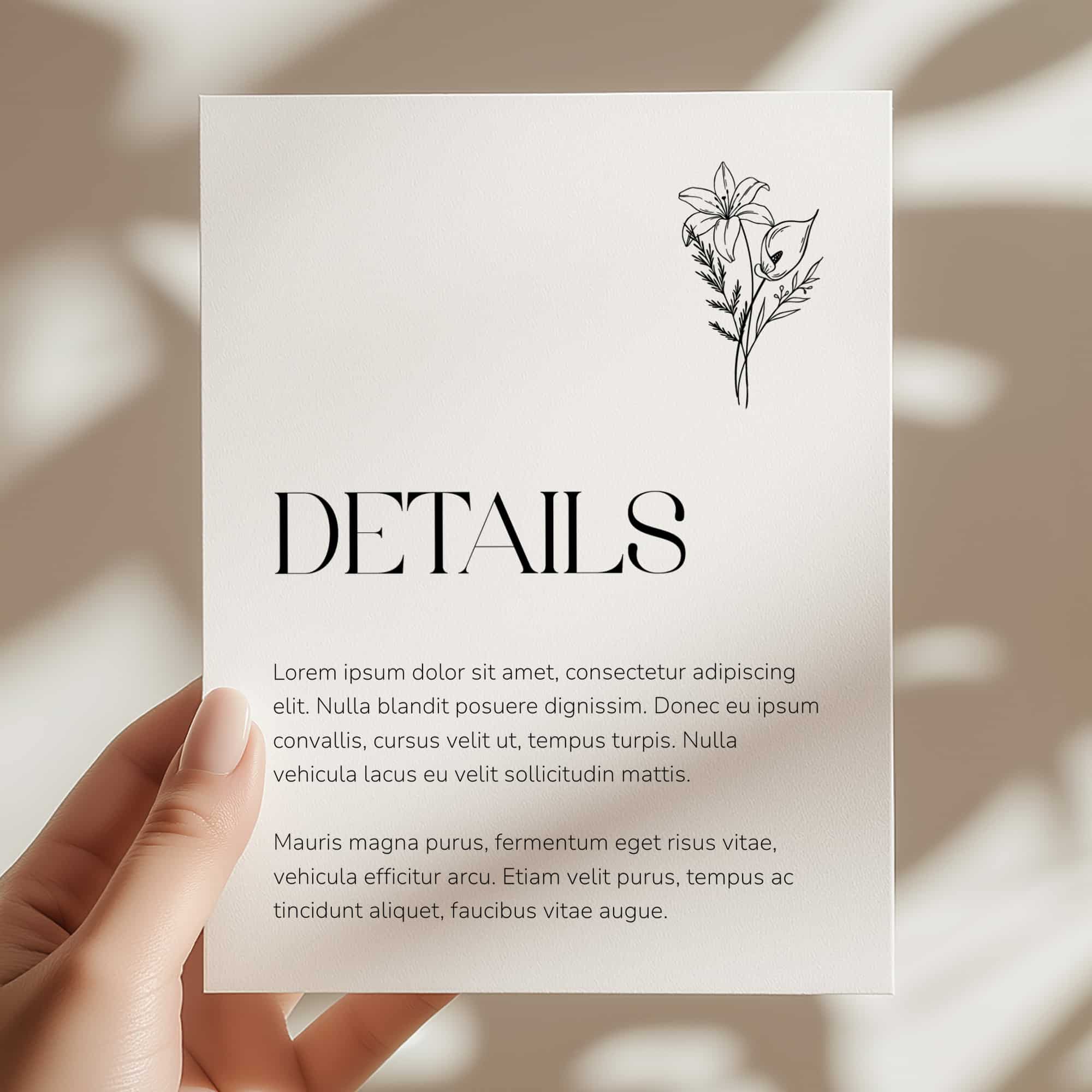 Classic typography paired with botanical detailing for a timeless presentation.