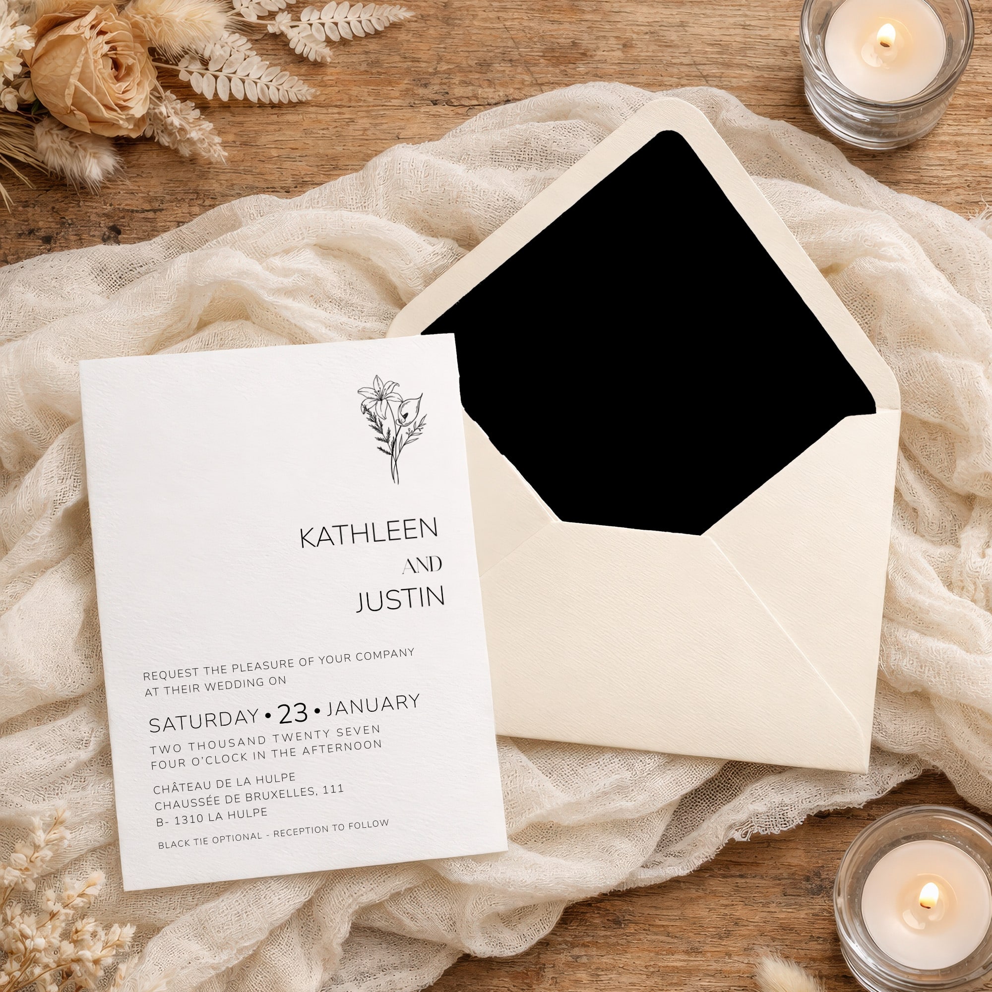 The beauty of black and white wedding stationery lies in its clarity. Every detail feels intentional, from the balanced layouts to the decorative titles and understated botanical elements. The result is a suite that feels elevated without being overly ornate, making it well-suited for formal weddings, black tie celebrations, church ceremonies, garden weddings, and modern city events.