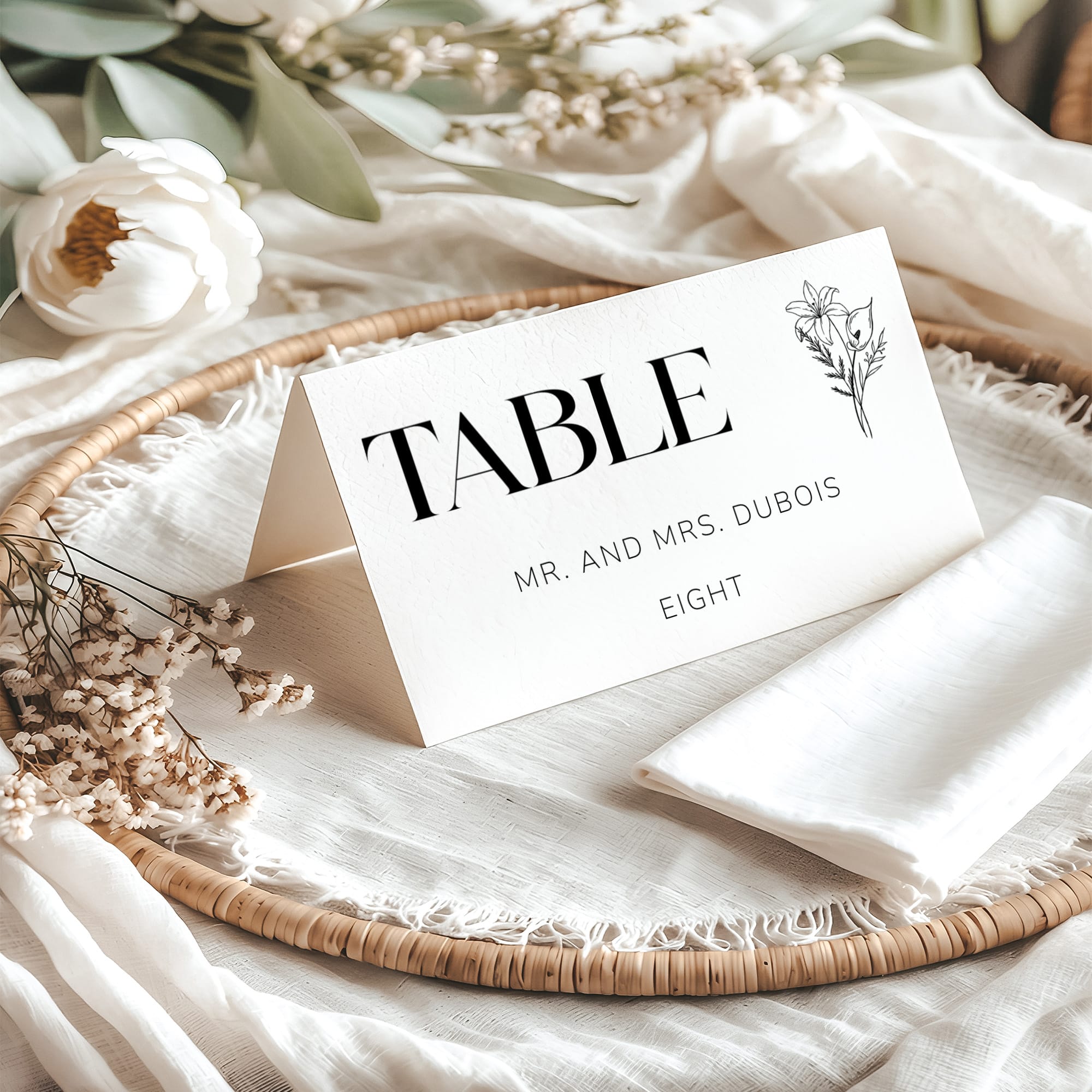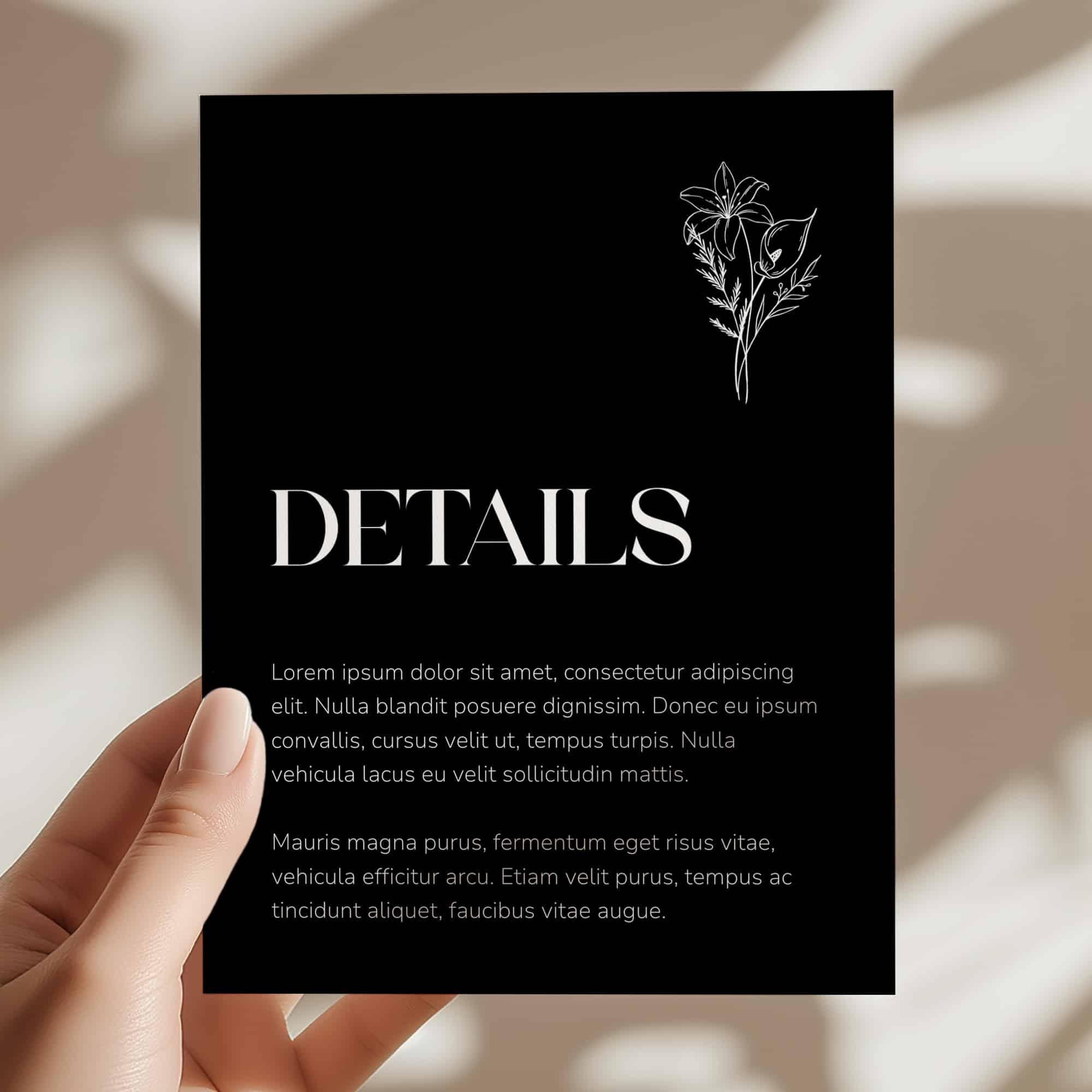 Classic typography paired with botanical detailing for a timeless presentation.