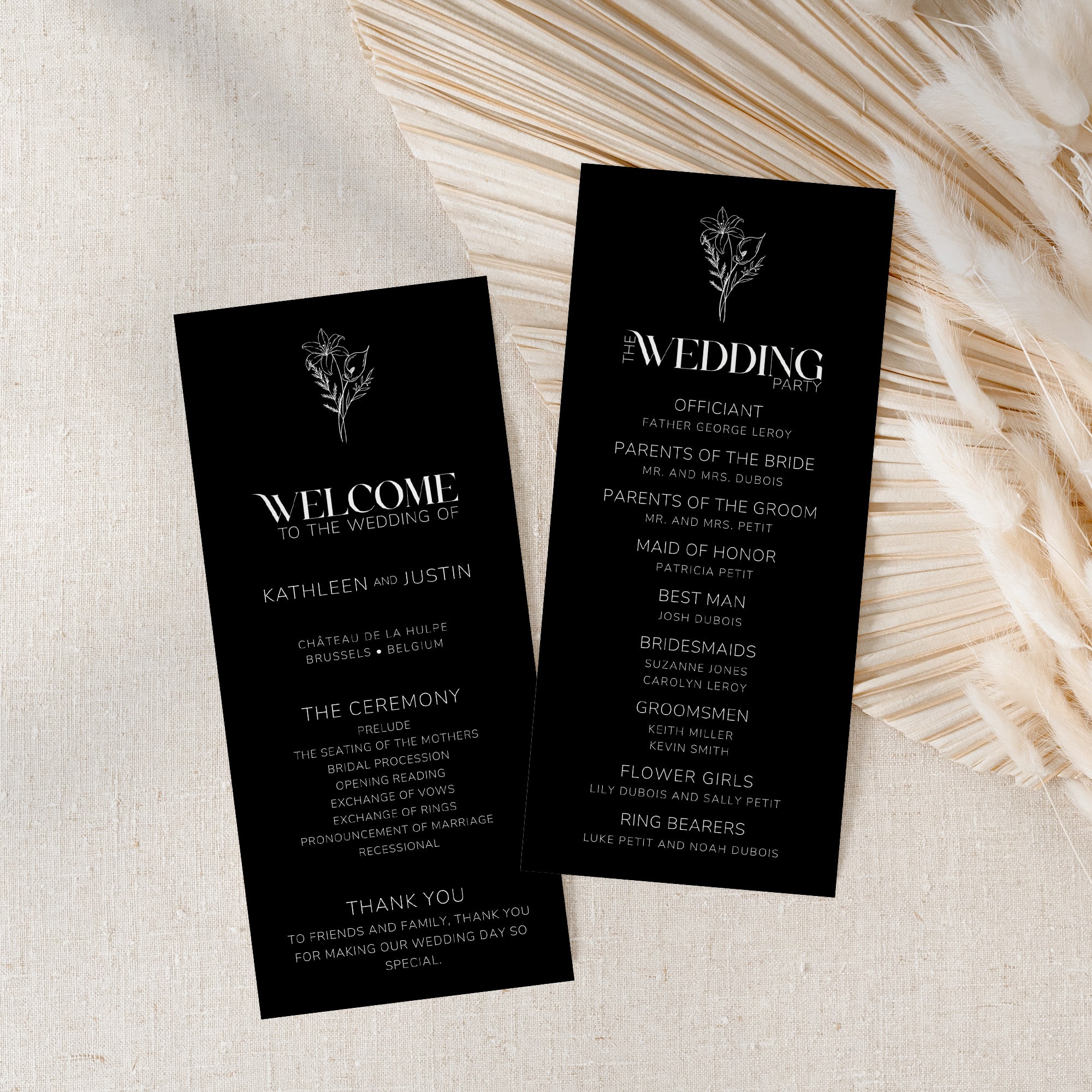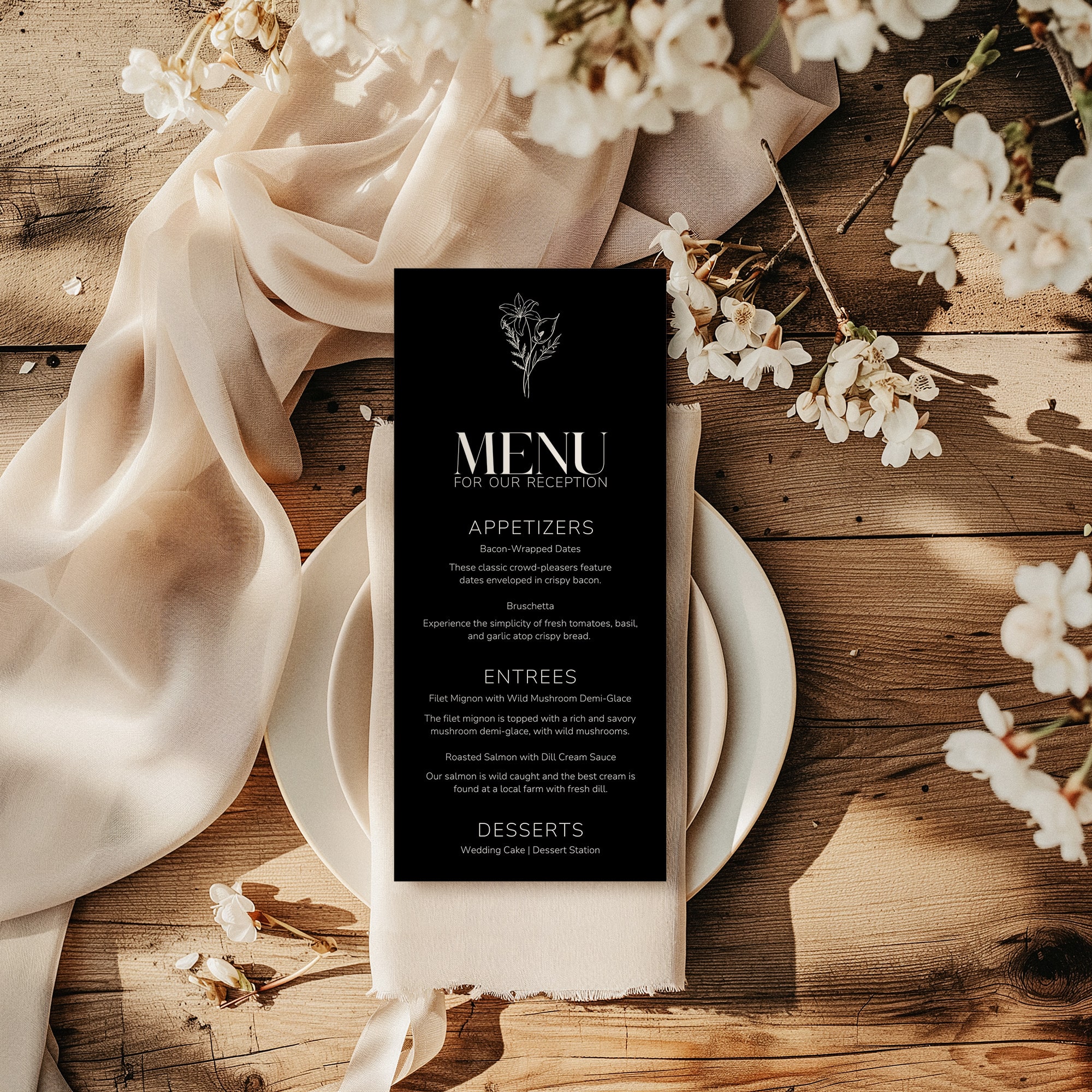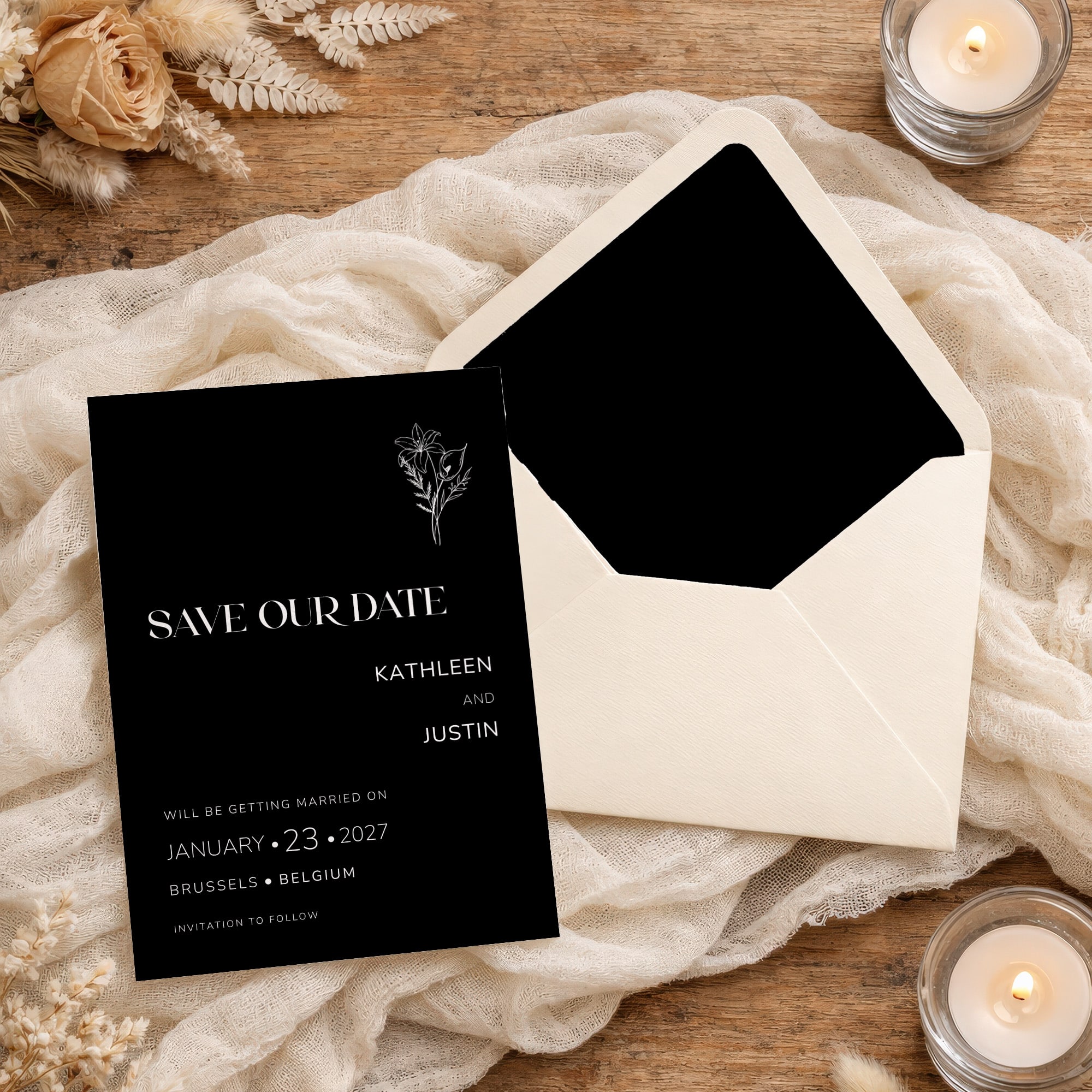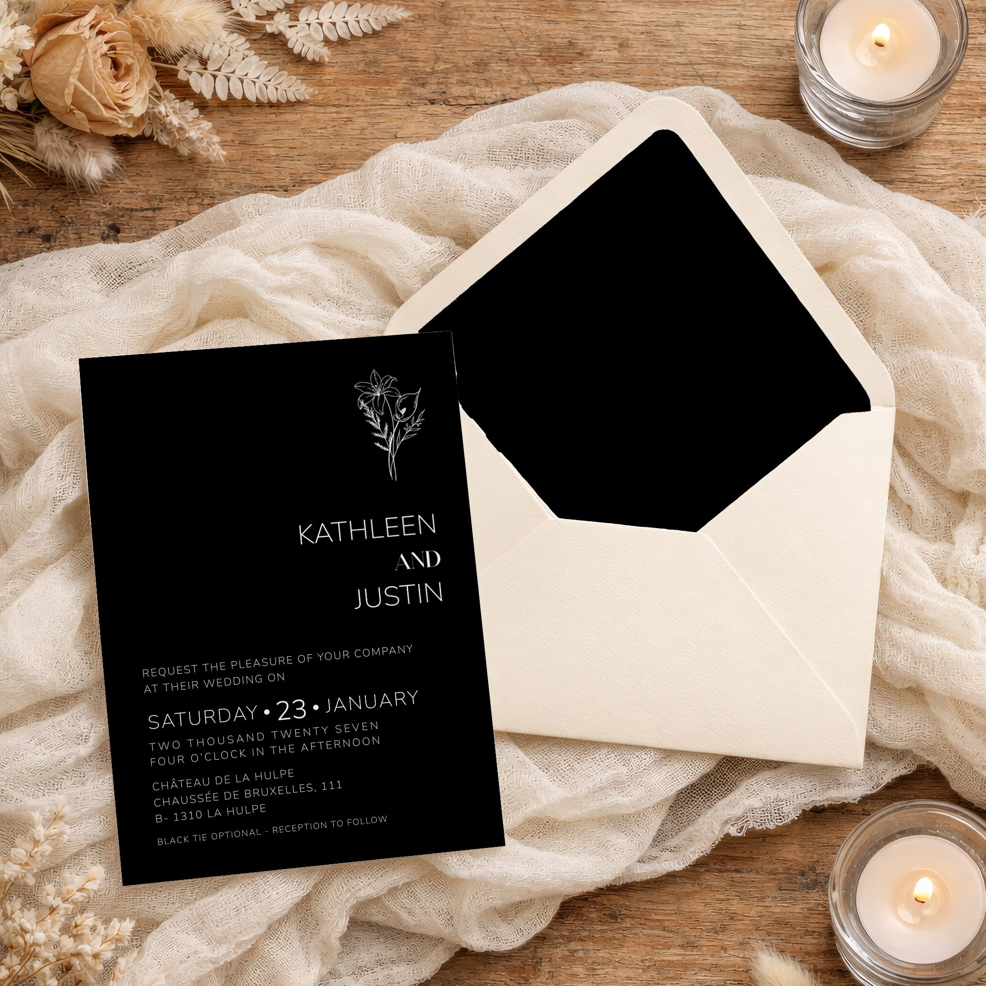 Fully editable in Canva, this collection allows you to customize your wording while maintaining a polished and cohesive design. The Noir Collection is ideal for couples who want their wedding stationery to feel refined, modern, and confidently understated.