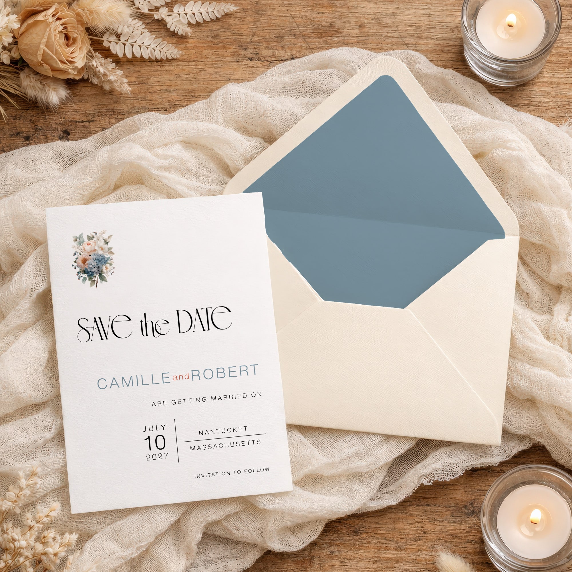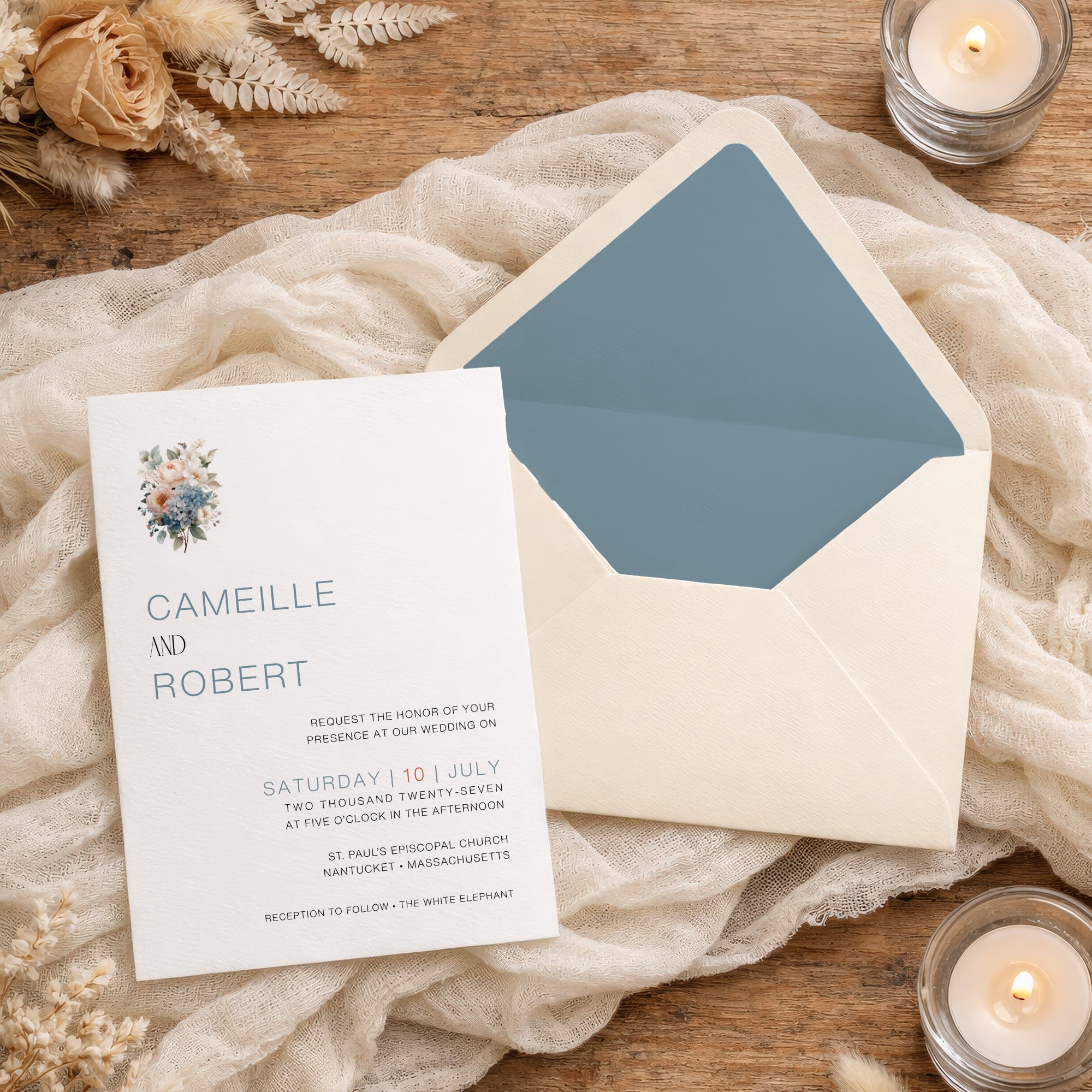 This collection is especially well-suited for couples who want a coastal look that feels refined rather than themed, with delicate botanical detail, soft color, and a light, sophisticated presentation. Whether you are planning a beach wedding, destination event, or simply love an airy and elegant style, the Coastal Collection provides a beautiful foundation for your full wedding stationery experience.