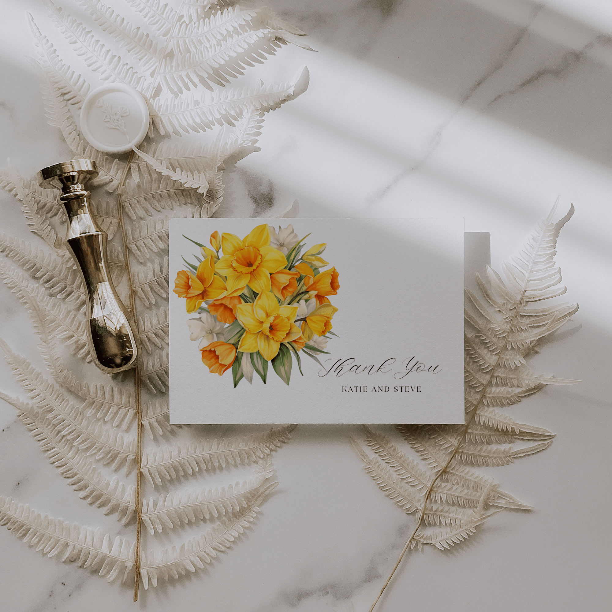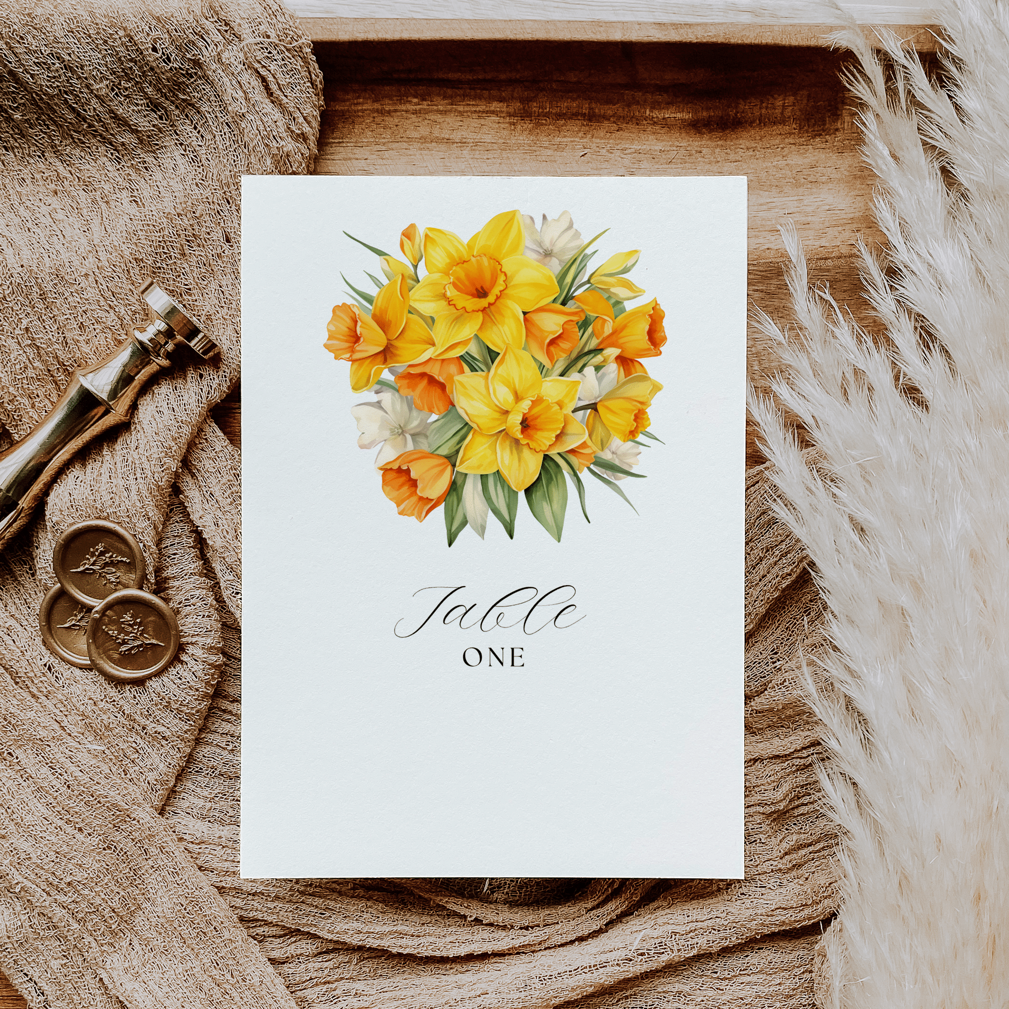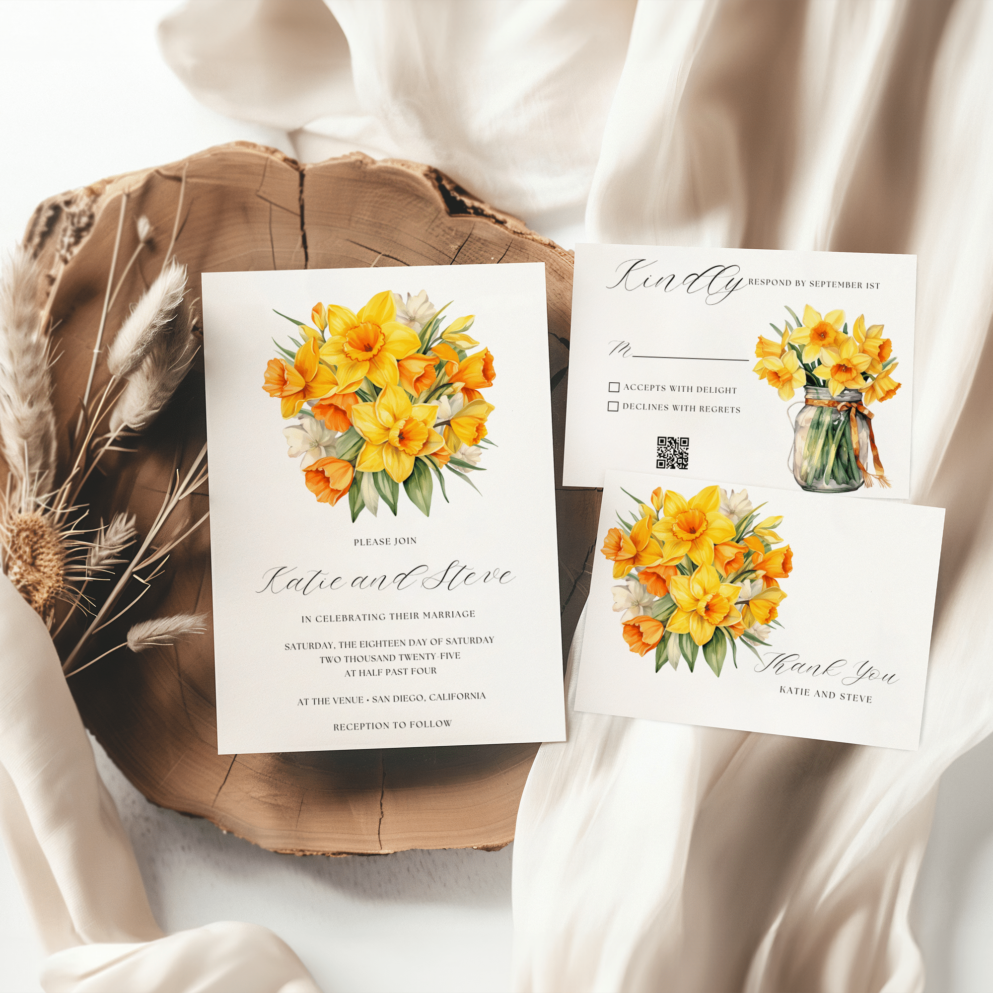 Bright yellow Daffodils invitation bundle with Save the Date, RSVP, Menu, Details & more. Canva-editable and instantly downloadable.