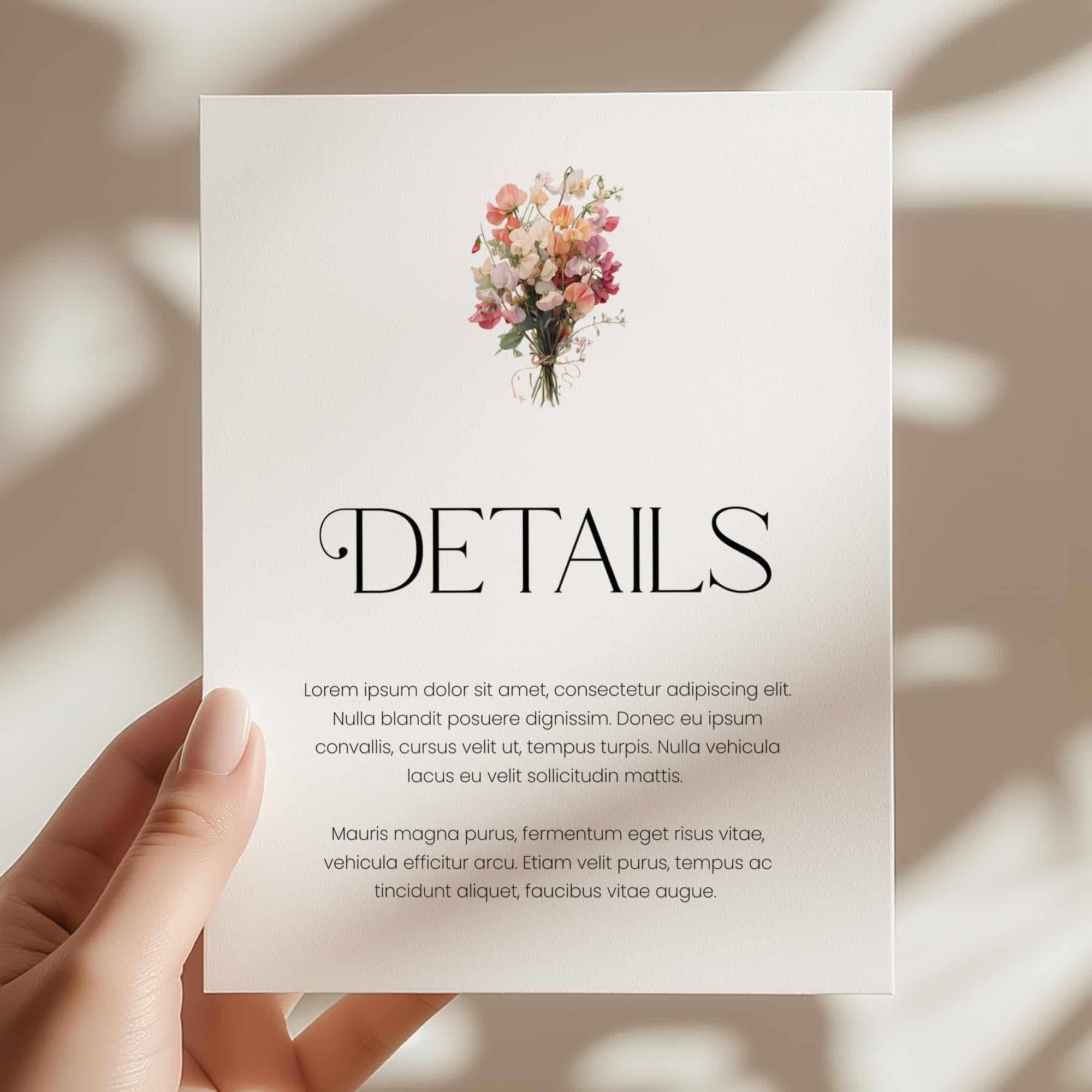 Ideal for accommodations, reception details, directions, or wedding website information. Orientation varies by collection layout.